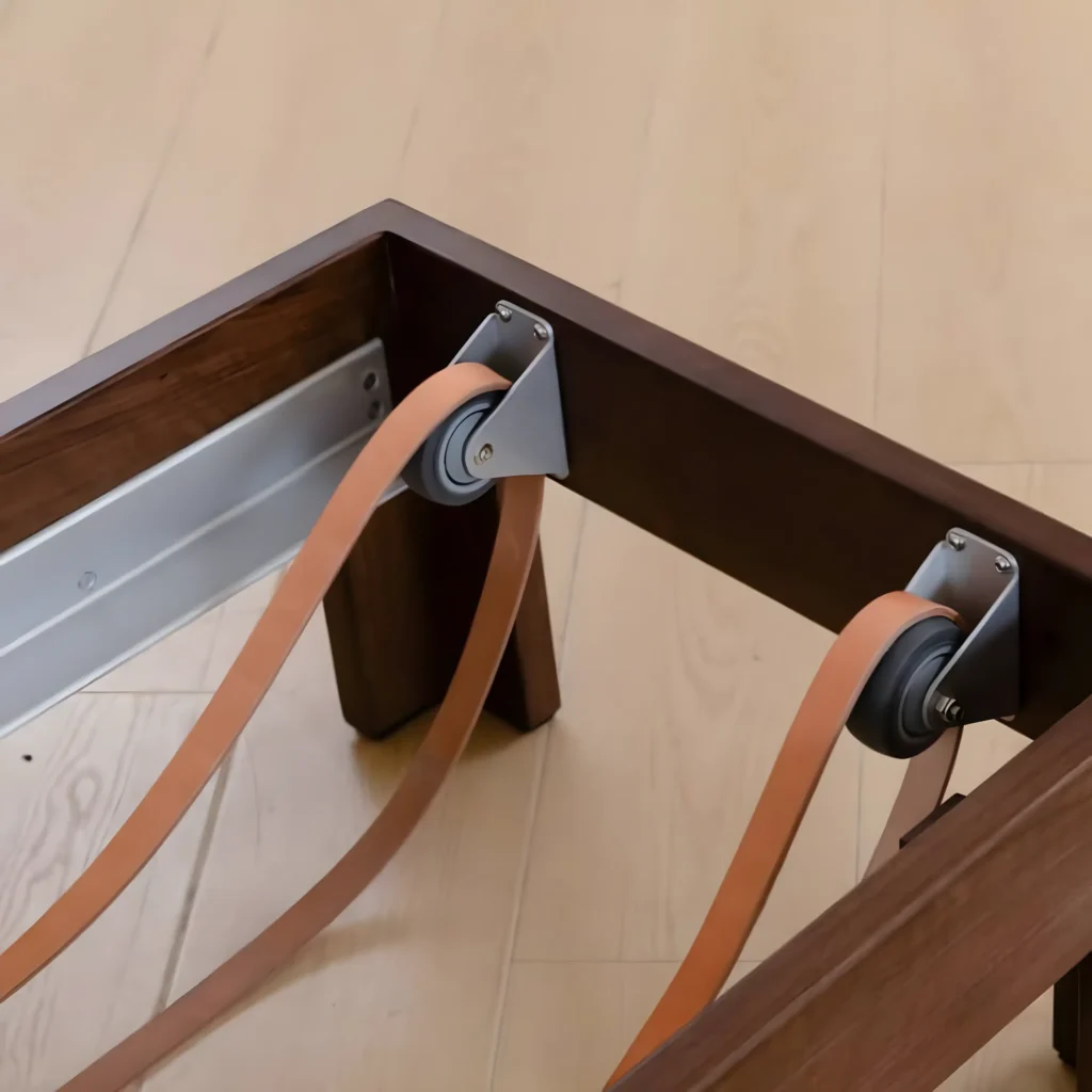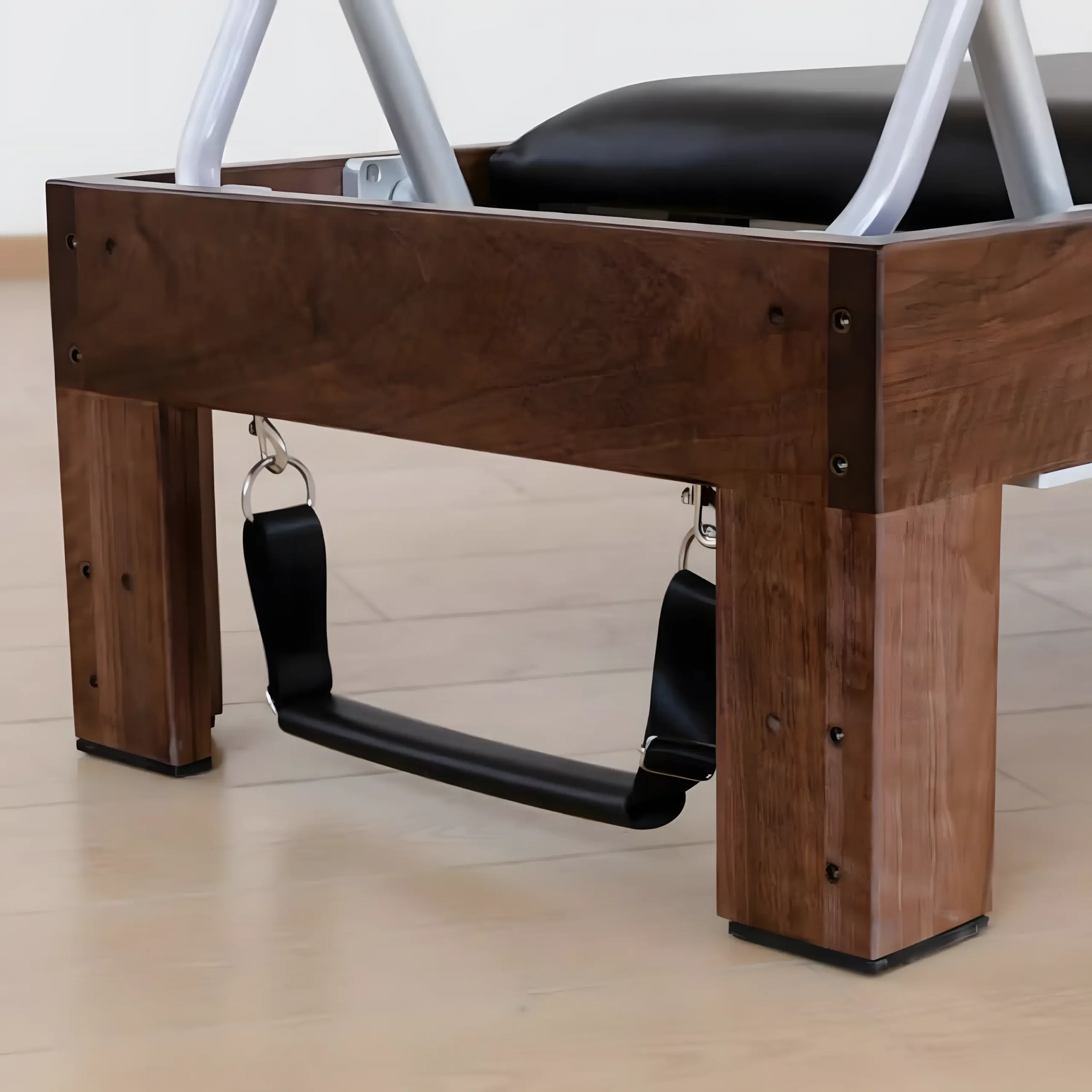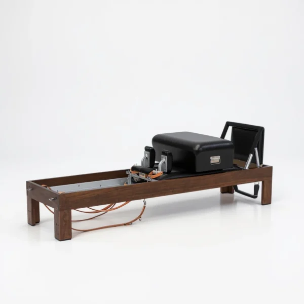 L’élégance du bois de noyer rencontre l’innovation technique dans ce Pilates Reformer. Ce qui le rend unique ? Un système de traction révolutionnaire : ici, les cordes ne passent pas par des poulies standards. Elles sont montées sur un système hybride exclusif, rappelant des élastiques gainés, pour une résistance douce, progressive, et fluide.