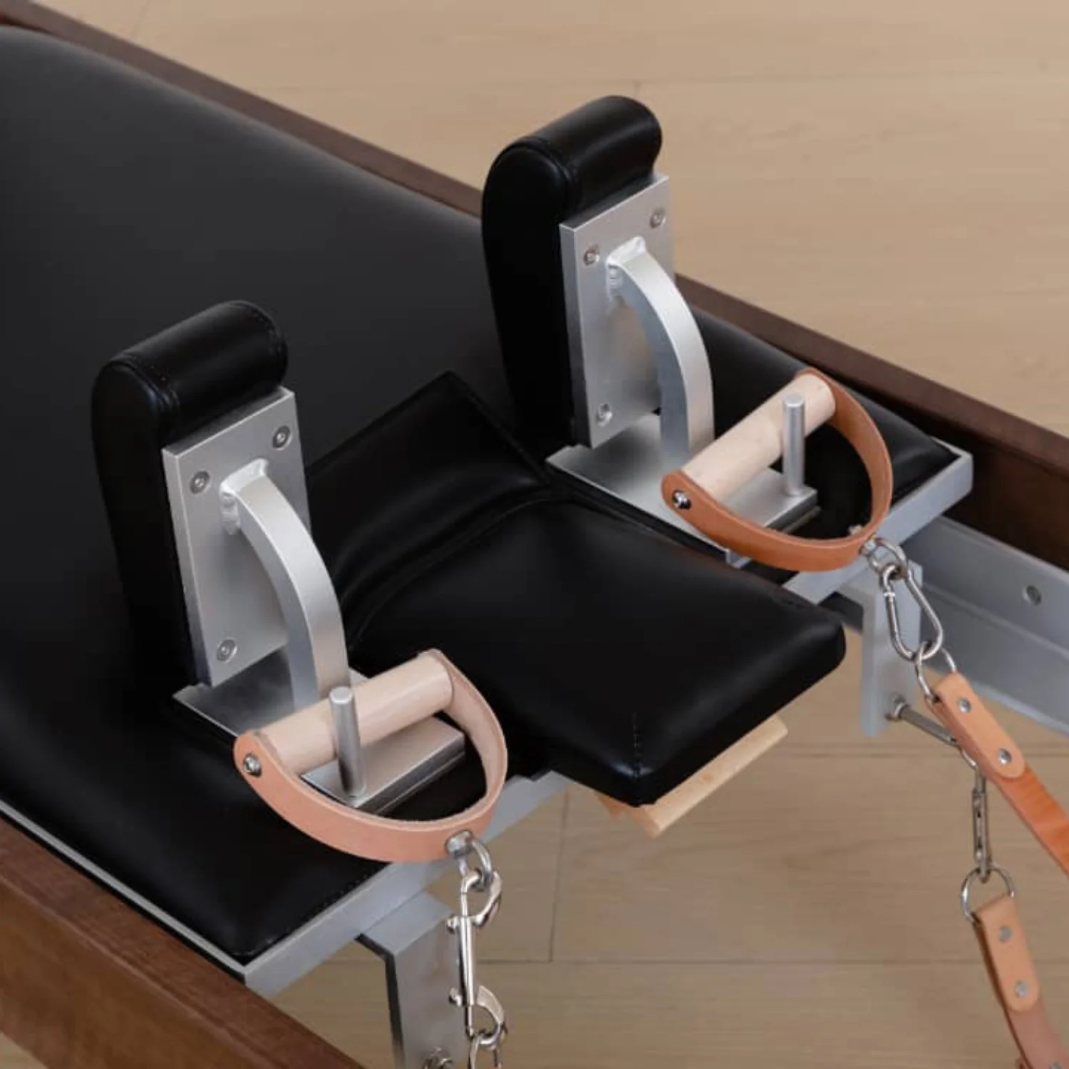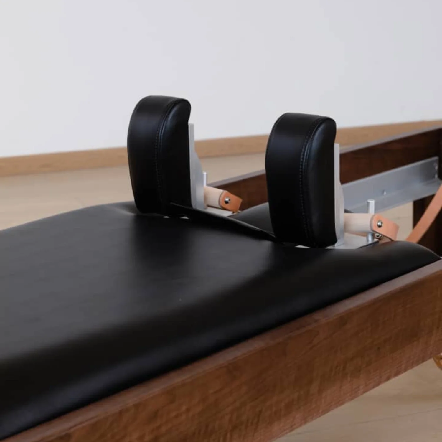 Ce Pilates reformer en bois de noyer incarne l’alliance du design haut de gamme et de la fluidité d’usage. Avec un système de poulie unique, il offre un glissement précis et silencieux, idéal pour les professionnels recherchant une esthétique chaleureuse pour porter l'identité de leur studio.